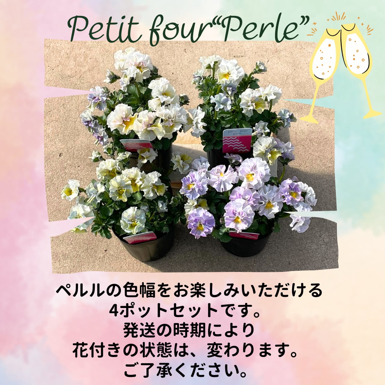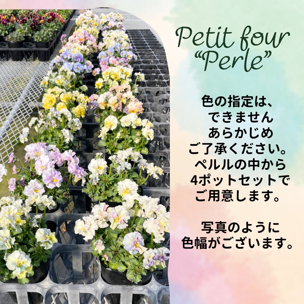 ・花苗は、1つ1つ個性があります。同じ品種・カラーであっても、お花の大きさや表情、色は全く同じではなく個体差があります。お届けする苗が、写真の色とは異なる場合がございます。