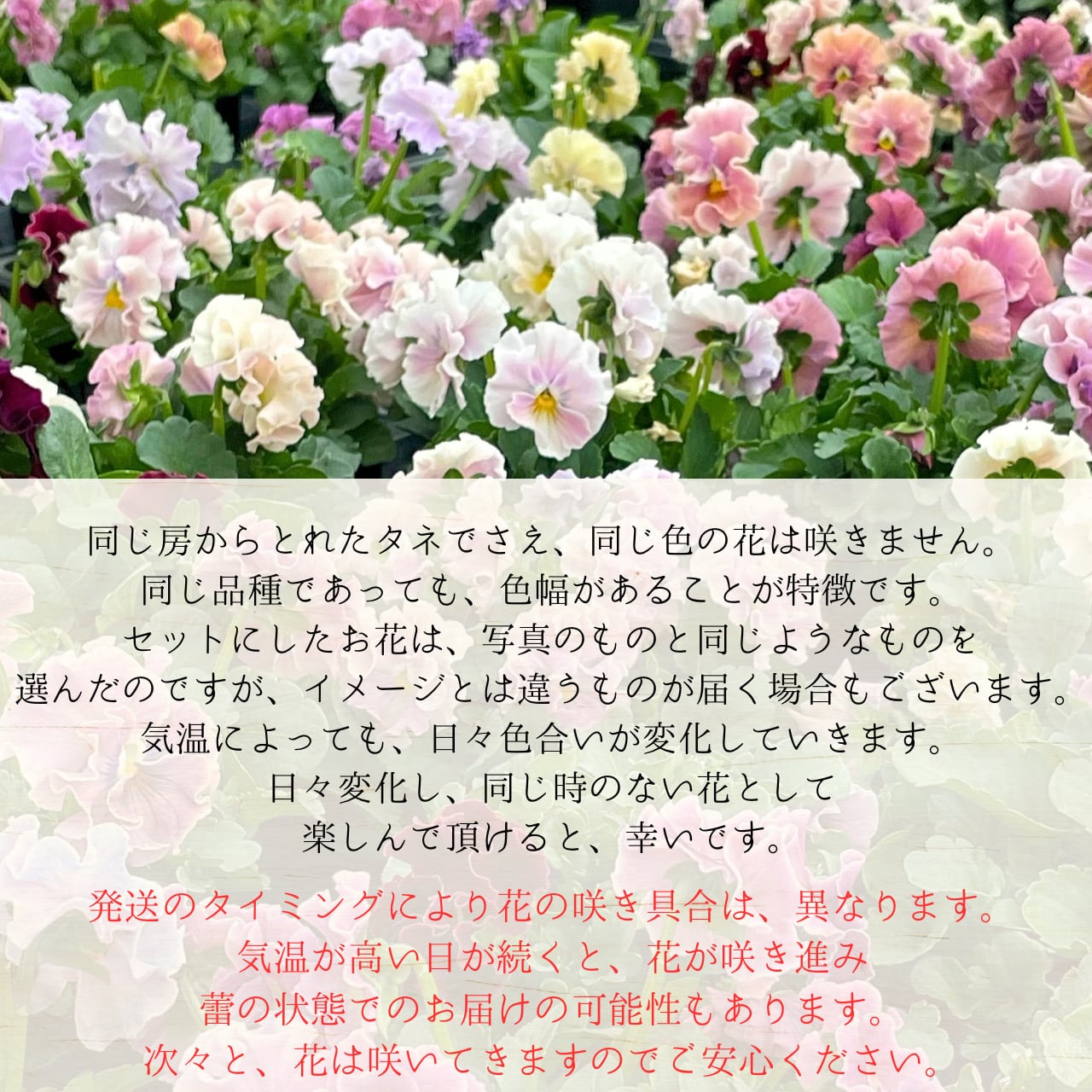 豊かな表情を見せてくれるのも魅力のひとつです。また、大切に育てた苗の破棄軽減のためにもご理解いただけますと幸いです。